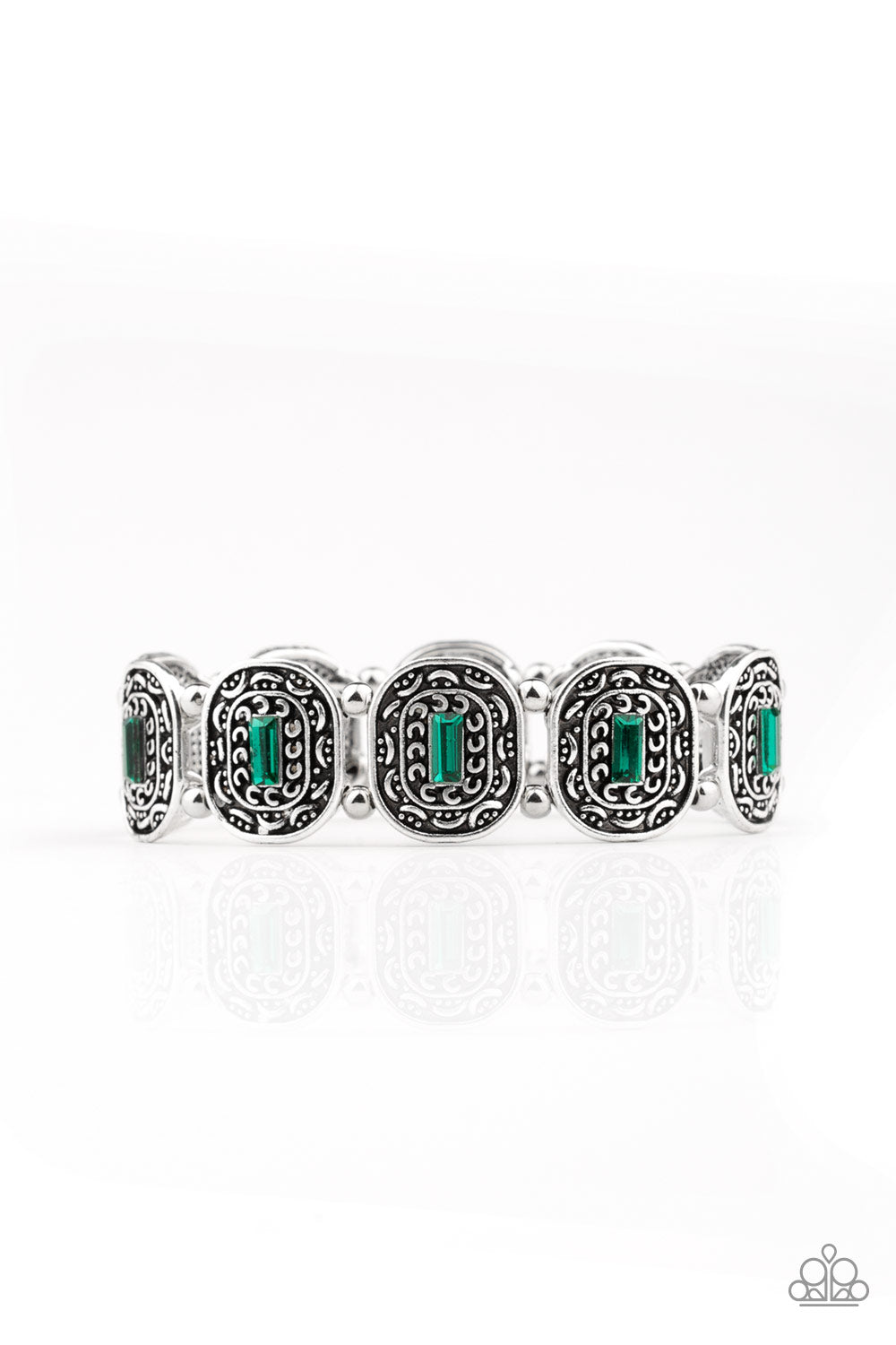 Featuring green emerald-cut rhinestone centers, ornate silver frames are threaded along stretchy bands around the wrist for a refined fashion.