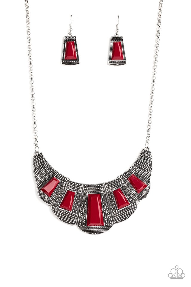 Featuring faceted emerald style cuts, bold geometric red beads are pressed into studded silver frames that dramatically link below the collar for a fierce finish. Features an adjustable clasp closure.