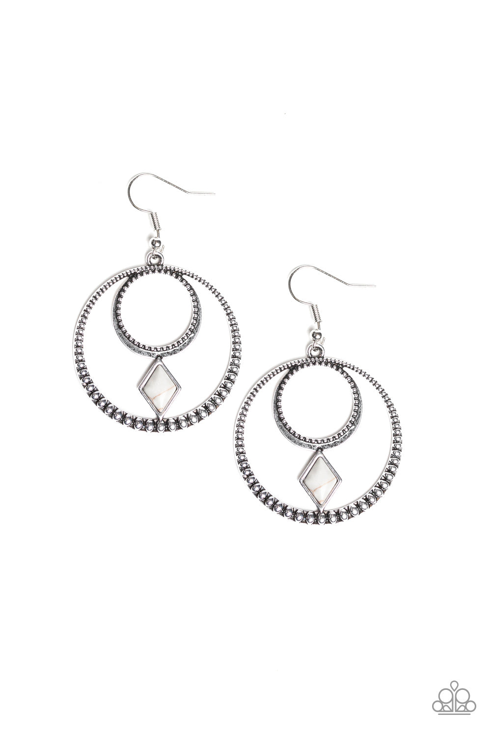 A diamond-shaped white stone is nestled between two studded silver hoops, creating a whimsically earthy frame. Earring attaches to a standard fishhook fitting.